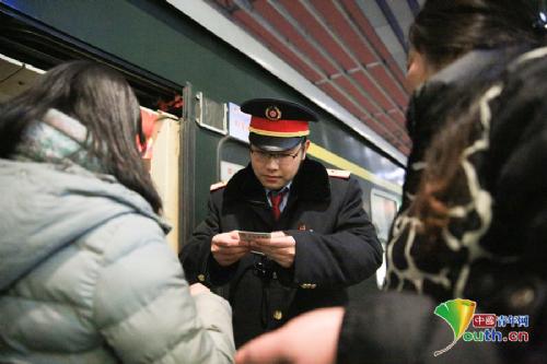 “共青团号”列车员查验旅客车票。北京铁路局团委供图