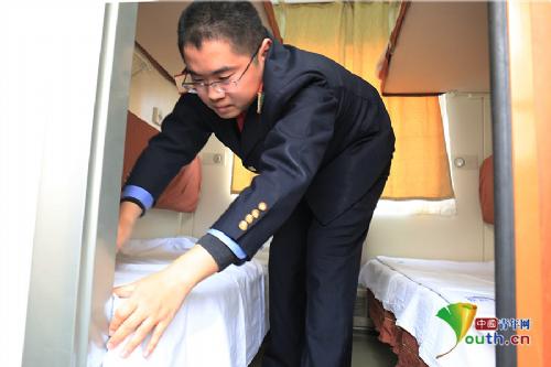 “共青团号”列车员石俊游更换卧具备品。中国青年网记者 朱梦琪 摄