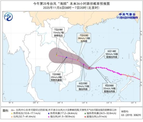 今年第25号台风“海鸥”今晨8时距离越南嘉莱省归仁市约335公里,强度已加强至超强台风级(16级,55米/秒,930百帕)。预计,“海鸥”将以每小时20~25公里的速度向西偏北方向移动,强度维持或略有增强,将于6日夜间在越南中部一带沿海登陆(40~45米/秒,13~14级,台风级或强台风级),之后强度逐渐减弱。