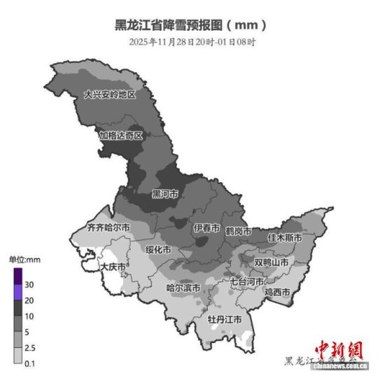 黑龙江省2025年11月28日20时至12月1日8时累计降雪量预报图。 黑龙江省气象局供图