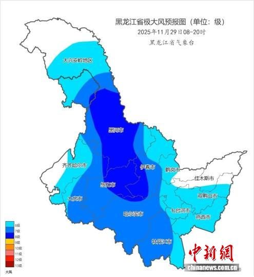 黑龙江省2025年11月29日8时至20时极大风速预报图。 黑龙江省气象局供图