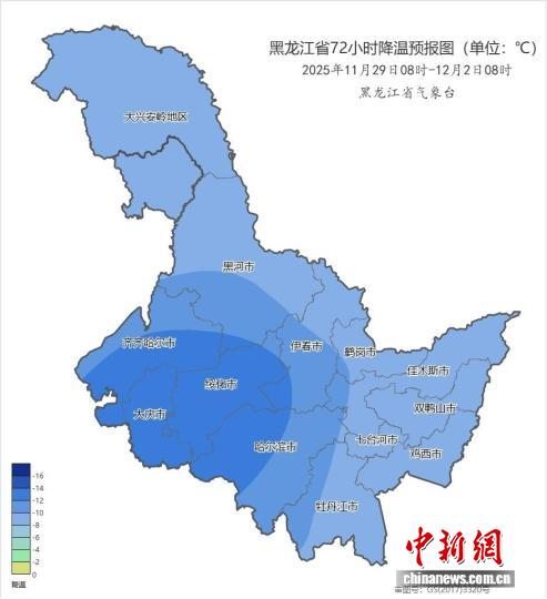 黑龙江省2025年11月29日8时至12月2日8时降温预报图。 黑龙江省气象局供图